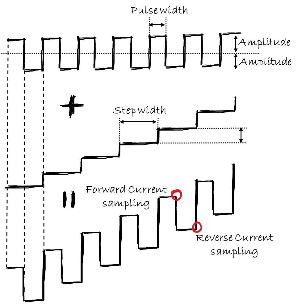 SWV is a pulsed electrochemical technique in which a staircase potential is superimposed with a square wave of defined amplitude and frequency. The net current is obtained by subtracting the current measured at the forward pulse from that at the reverse pulse, reducing background capacitance. This is because capacitive current responses are almost instantaneous to voltage changes, meaning it is nearly the same in both forward and reverse pulses. By subtracting the two measurements, the nearly identical capacitive components cancel out, while the Faradaic (redox) component, which depends on electron transfer kinetics, remains.